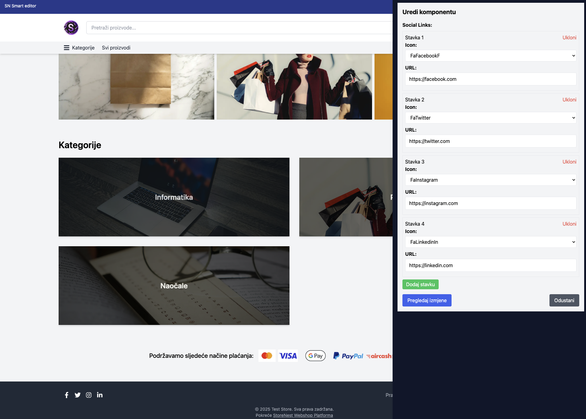 Podnožje web trgovine može se prilagoditi kroz Smart Editor kako bi sadržavalo važne informacije, društvene mreže i druge korisne poveznice.Primjer podnožja